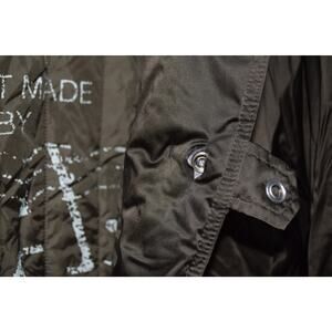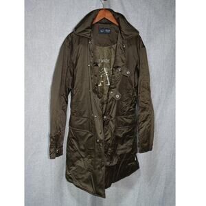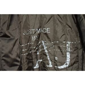 Authentic Armani Jeans long coat in olive green with quilted lining. Features full zip and snap button closure, multiple front pockets, and printed “Just Made by AJ” branding inside. A stylish, lightweight coat perfect for layering.