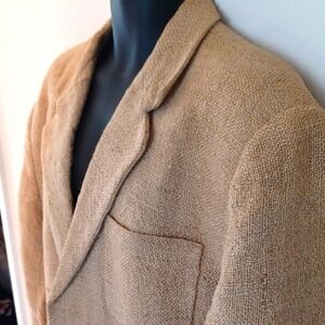 This Armani Jeans sport coat in a warm tan hue is crafted for a relaxed fit, offering a timeless and versatile style. The notched lapels and textured weave add a touch of sophistication, making it ideal for both casual and semi-formal occasions. Rip on one lower front pocket, as pictured. In good, gently-used condition.