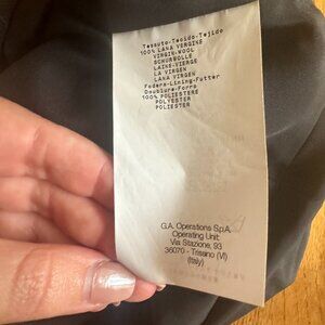 It is 100% wool, with a 100% polyester lining, that will be a wardrobe staple for any formal or cocktail events. With a hidden zipper with clasp in the back, darts for the bust and pleats at the front of the waistline, this is very flattering to wear. There is also a small slit in the center of the back of the dress for comfort. This dress has been worn less than 10 times, and cared for in a meticulously clean, smoke-free home.