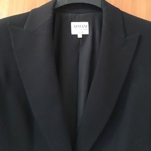 Armani Collezioni black blazer, single front button. Size 2. Made in Italy. Barely used. Great for work! Outer- virgin wool, inside lining- polyester