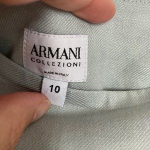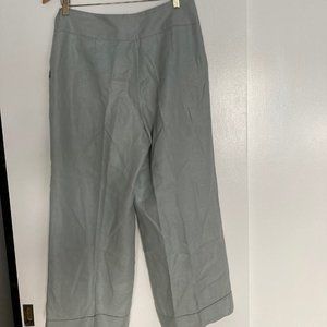 These Armani pants have a 4 button decorative front and a side zipper. They have wide cuffed legs. The color is like an icy grey blue. They are on in good condition except they need to be pressed/ironed). 100% linen