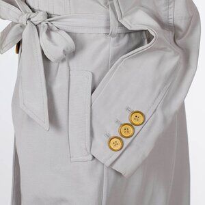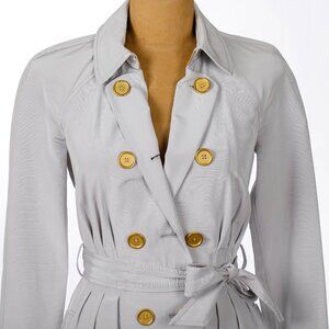 Beautiful Silver Color Trench Jacket or Coat by Armani Exchange. Gold Color Buttons, Belted, with Pleated Waist and Side Pockets. Not Lined.