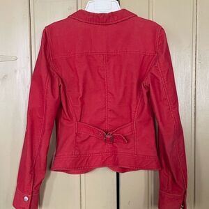 This is a faded red in color. Very close to 5th picture. Beautiful neckline and logo buttons. Winches at waist with buckle in back. 2 button cuffs. There is a mark at first button. I enhanced to show it well. The last picture is a natural picture of mark. Tag size medium. Bust pit to pit 19”. Length 21”. Arm 25” top of shoulder to end of cuff.