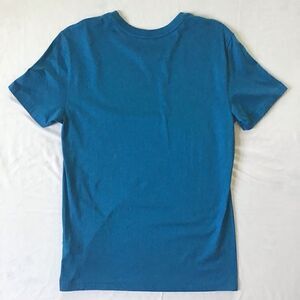 Blue Cotton Tee with yellow logo spell out on front. There is a small hole in the collar and slight piling from hanging in closet with other shirts. Please see pictures provided.