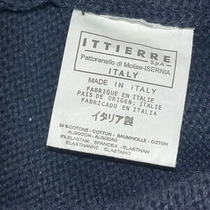 Thick, amazing sweater labeled with the Armani Jeans logo. Navy blue with light blue trim and navy and red lettering on the bottom left logo