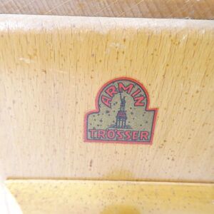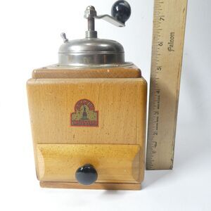 Vintage Armin Trosser coffee grinder. Wooden with a hand crank. Made in West Germany. Good shape overall, some surface wear. Small burned area near one bottom corner. Grinding mechanism is squeaky (could probably use some oil) and has not been tested with beans.