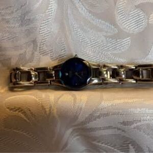 This beautiful women's wristwatch from Armitron features a silver-tone stainless steel case with a glossy finish and a round watch face with diamond markers and a blue dial color. The watch is powered by a quartz movement and has a two-piece strap with a buckle closure. It is a vintage piece from the 1970s with a reference number of 75/2407 and comes with a snap caseback.