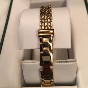 I was told this watch was true gold but It's definitely not because my wrist turned green when I wore it only once. Nonetheless, it's a pretty nice dress watch. It's made by Armitron and has a mesh band with a diamond design. Its been sitting in my closet for years so it needs a new battery but I do have the original box. ITS 7"