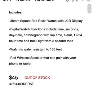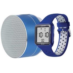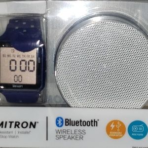 Modern design and functionality make this Armitron sport watch a smart choice for any day of the week. Water resistant to 165 feet (50M). Comes ready for gifting with a Bluetooth wireless speaker. Chronograph Lap time Alarm Military time, Backlight, Bluetooth wireless speaker. PLEASE NOTE: The picture posted showing Armitron's item description and original price describes this set as being red but the set that I have available is BLUE. and is unisex
