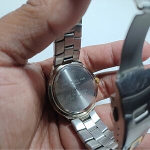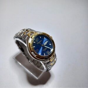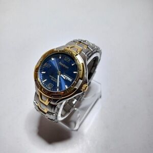 Armitron Watch Men Gold Silver Two Tone Round Blue Dial Day Date New Battery shows signs of wear such as scratches on case band and glass see pictures for reference