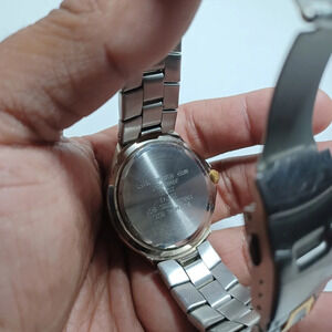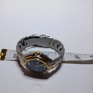 Armitron Watch Men Gold Silver Two Tone Round Blue Dial Day Date New Battery shows signs of wear such as scratches on case band and glass see pictures for reference