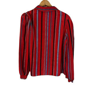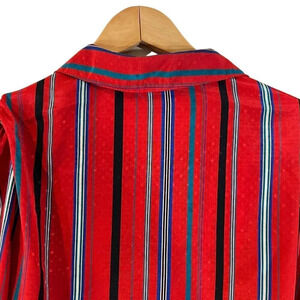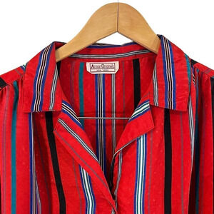 Elevate your wardrobe with this vintage Armon Originals button-up blouse. The top has a beautiful sheen and shimmer where the subtle polka dots are in the pattern. The multi-pattern design boasts a combination of playful polka dots and classic stripes, making it perfect for any occasion. The collared neckline and long sleeves add a touch of sophistication, while the lightweight and unlined features make it suitable for all seasons. This blouse is perfect for women who love to mix and match and is available in regular size. The button closure and accent buttons add a stylish touch, making it suitable for casual and formal events, workwear, and even business meetings. Whether you're attending a party or going on a date, this colorful and classic blouse is sure to turn heads.