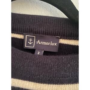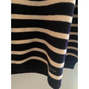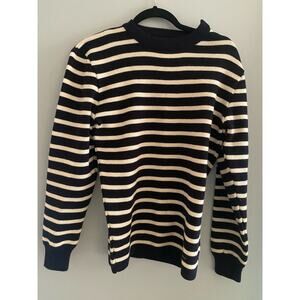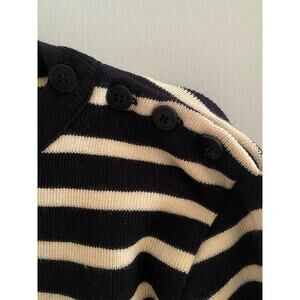 Classic navy and white striped 100% merino wool sweater. Features button detail on shoulder. Comfortable and stylish.