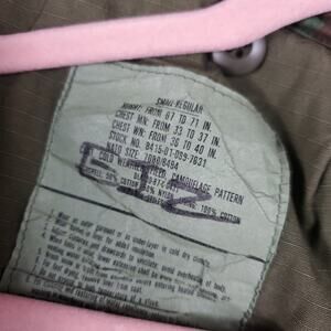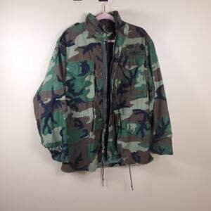 Gently used. Size small. Woodland green camo. Heavy weight army jacket with multiple pockets, full zip, hidden hood. Cotton blend.