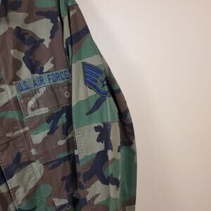 Gently used. Size medium. Woodland camo. long sleeve, light weight jacket. Multiple pockets on front. Covered button front. Button cuffs. 100% cotton
