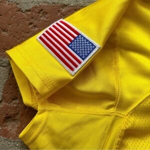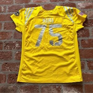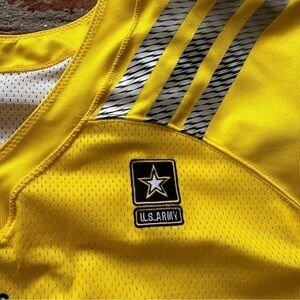 Army Football Adidas Away Game Uniform Jersey 3XL Mama #75 yellow, silver and black. This Jersey is a rare find for any army enthusiast. Yellow jersey with V-neckline, short sleeves, and authentic army logo is made of high-quality jersey fabric, ensuring comfort and durability. The jersey features the number 75 and MAMA written in the back. Size 3XL, 100% polyester and Made in the USA.