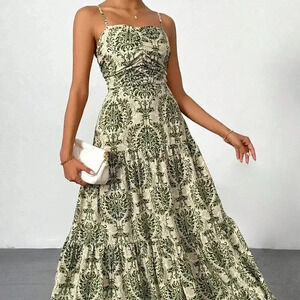 Army Green Boho Women's Vacation Printed Bohemian Backless Maxi Cami Dress