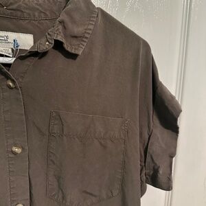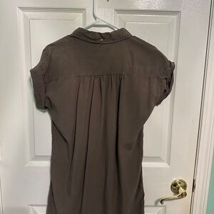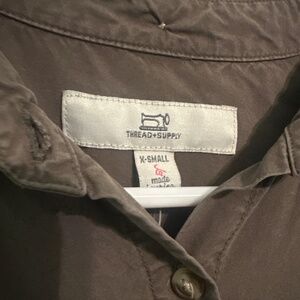 Effortlessly casual and stylish, this Thread + Supply army green button-down shirt dress is perfect for layering or wearing solo. Features a classic collar, rolled short sleeves, dual chest pockets, and a raw hem for a slightly edgy look. Lightweight and comfortable, ideal for spring, summer, or as a transitional piece.