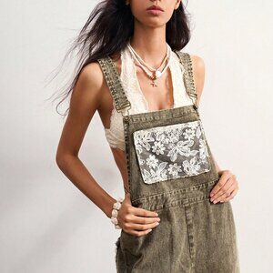 Army Green Casual Womens Boho Woven Loose Washed Patchwork & Lace overalls pants