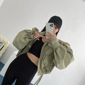 Army Green Casual Women's Flap Pocket Drop Shoulder Drawstring Hem Jacket