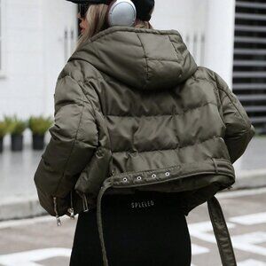 Army Green Casual Women's Hooded Asymmetric Zip-Up Belted Short Padded Coat