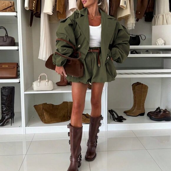 Army green casual two‑piece set includes a short jacket and matching shorts. The jacket features a classic collar, long raglan sleeves, and button front, while the oversized, unlined design offers a relaxed fit. Crafted from non‑stretch fabric, it’s ideal for daily wear, sports, vacation, or home.