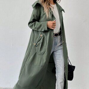 Army Green Casual Women's Solid Color Double Pocket Long Jacket