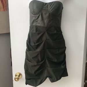 This army green dress is zipper back with beautful soft pleats on the botton and sexy bodice like vegan leather top. It is also a-cymetirical