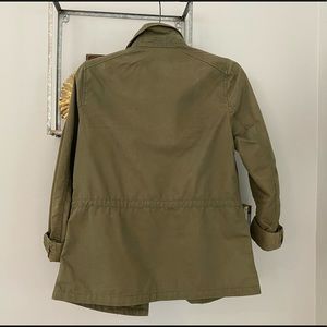 Vintage-looking army green jacket by Banana Republic. Two large pockets in the front and two small pockets on the breast. Drawstring inside to cinch in waist. Tortoise buttons. Sleeves are shown rolled but come all the way down.