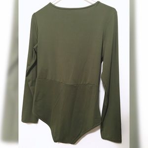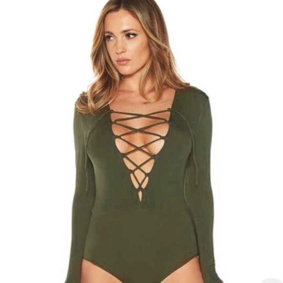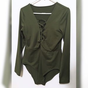 Army green, long sleeved lace-up body suit in the size XXL (runs small). Has been worn once, great condition. The fabric is silky smooth and very stretchy. Adjustable straps down the center.
