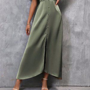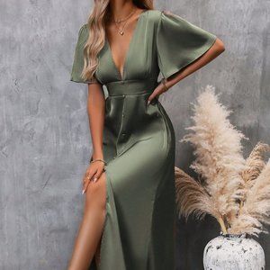 Army Green Preppy Womens Plunging Neck Butterfly Sleeve Button Front Dress