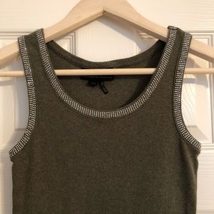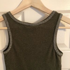 Sexy Rhinestone lined ribbed tank. Dark green or olive green and would go great with camo. Gently used. One tiny rhinestone missing on left shoulder as seen in picture. Cute and comfy tank for st. patty's day.