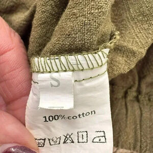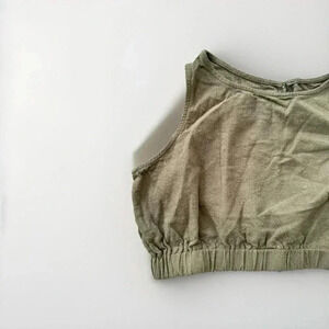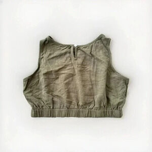 This is an army green crop top in size Small for women. It features a sleeveless style with a round neckline and a relaxed fit. The top is made of cotton material and has a casual fit. The design is solid with a cropped length, perfect for a casual and stylish look with an army theme.
