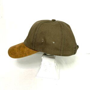 Army Green & Tan Faux Leather Baseball Hat. Heavy Canvas. Neutral. Minimalist. Quiet Luxury. Adjustable. 85% Cotton, 15% Acrylic. Very good condition.