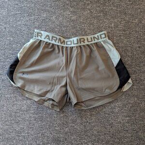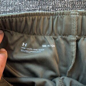 Size small Under Armour athletic/lounge shorts. Color is army green with green and black accents (color is more green than it shows up in the lighting). Not worn many times before I gained too much weight to wear them, great overall condition.