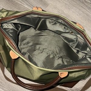 Beautiful army green colored duffle bag. Very spacious inside with inner zipper compartment and two additional pockets. Two handles on top and long adjustable strap. Slight wear on bottom of one corner that is not noticeable unless up close.