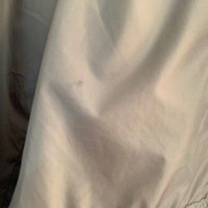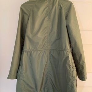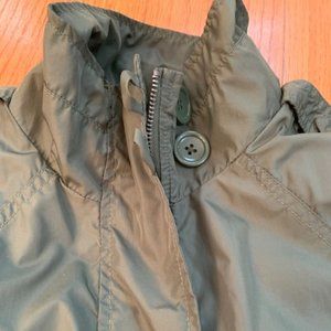 Flattering Target Brand (Xhiliration) non-wrinkle light coat. Great for rain/wind/travel; packs easily and versatile to wear with anything underneath. Lots of pockets, standing collar, buttoned shoulders, loose fitting. Flattering fit and style but I just have too many coats. A small mark on back and near bottom button flap; not too noticeable but posted in last 2 pics.