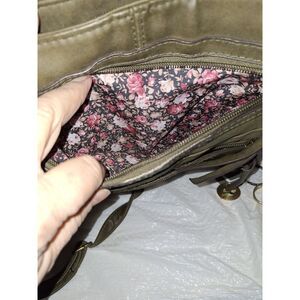 A really cute crossbody purse in a dark army green. The material in the pockets is a busy bright floral print. This piece has two zippered pockets on the exterior front, a large interior pocket with one zippered pocket on the back interior along with two media style pockets on the front interior. This is very nice pre-owned condition with an adjustable strap. It does have some embroidery detail around the front lower pocket. This is a medium sized bag about 11" x 11".