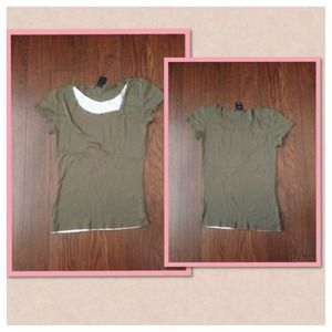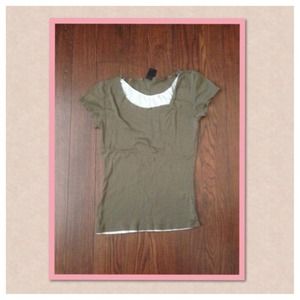 Army green and cream short sleeve shirt. Has a little ruche on top right. 100% cotton.