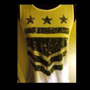 Green & gold high-low top. New without tags. Pure white high-low tank top with army green and shiny gold design. Ordered from Nordstrom (teen) but never worn. H.I.P brand. Size small but also fits medium size. Will steam upon request prior to shipment. No refunds.