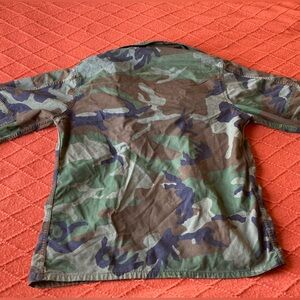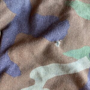 Great condition cami coat, no names or badges on it. A few small wear and tear marks (both pictured) seems to fit like a Men’s medium. Cute for baggy styles and fun to roll up sleeves for casual glam.