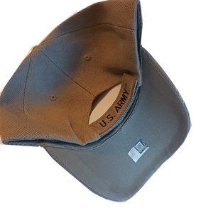 Beige 6 panel acrylic hat with "Army Retired" in black embroidery and the U.S. Army crest on the crown. The left edge of the brim has the U.S. Army crest in embroidery. The back of the hat has an adjustable velcro tab closure imprinted with "U.S. Army." One size fits most adults.