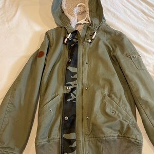 Army green with camo details roxy jacket. Sherpa lined size S