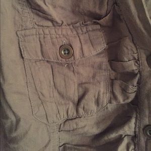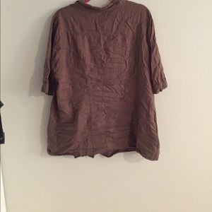 Army green with metallic details for buttons. Half sleeves, can be worn open or buttoned, looks cute with dark jeans and a tank!