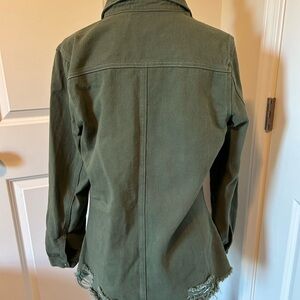 Army green denim, distressed, button-down jacket with collar