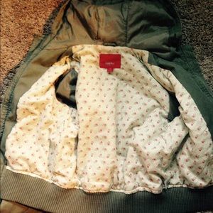 Soooooo cute army green jacket very warm!! Not long and has great pockets... Cute floral inner lining and great hood!!!!