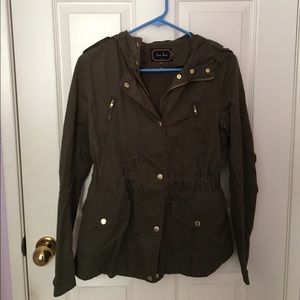 Olive green jacket. Has hood. Has buttons and a zipper. Never worn, but a little wrinkled