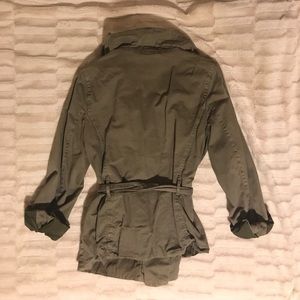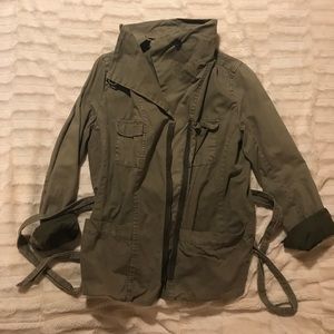 Asymmetrical zipper, large collar that can be worn up and buttoned at the neck or lay flat. Only worn once.