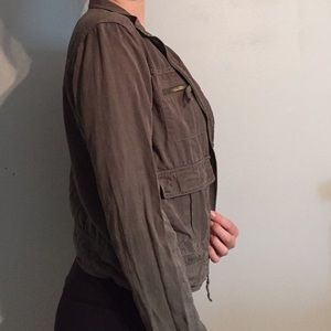 Light weight army green zip up jacket. This was worn 1 time and is as good as new. The zippers are gold and it has pockets in the front. The back is plain green. The material is very comfortable and lightweight.