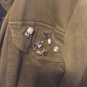 Perfect for spring weather this army jacket is really cute with some jewels to make it a little more girly. Size small. Classic army green color.